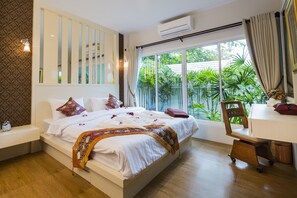 We loved our stay here, having the separate villas was great for the mix of families. Great pool and amenities in each villa. Poo, the house keeper was sensational! She was so attentive and kind, helpful in booking trips, getting us the best price and catering the most delicious breakfast. She even got me a cake for my birthday. It was so nice to have someone help keep the place tidy so everyone got a holiday! I’m sure all mums can relate. A short drive from the main centre but there is are 2 free rides per day in the tuk tuk so it was easy to get in and out. Highly recommend and have nothing but thanks for poo and her team :)