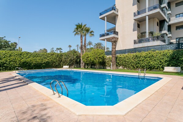 Guests of this apartment enjoy access to a shared outdoor area with a pool (open from 9 am to 9 pm), a garden, a children's pool, a barbecue, and a playground. Moreover, there is an on-site bar and restaurant, as well as a sports court.