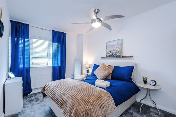 Our second bedroom contains a comfortable double bed, black out blinds and ample storage space.