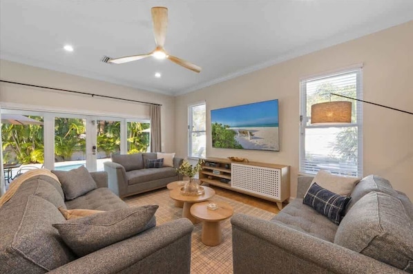 The bright living area offers comfy seating, a TV 📺, and plenty of space to plan your island adventures. The fully equipped kitchen features an island with seating, flowing into the dining area for family meals or take-out feasts 🍽️. Step out to the screened lanai and poolside dining area to enjoy the tropical breeze and grill up fresh seafood 🦐🔥.