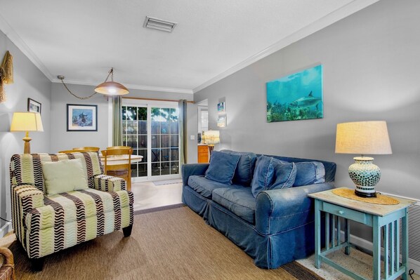 The breezy open concept living and dining area features coastal décor, comfortable seating, and a TV for family movie nights. A fully equipped kitchen provides everything you need to prepare meals or snacks, while the dining table and outdoor bistro set offer flexible dining options. A queen sleeper sofa in the living room adds extra sleeping arrangements for families or groups.