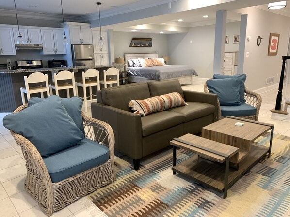 The King bed is spacious. The Queen sleeper sofa by American Leather is the most comfortable on the market. Note that this apartment is a studio, and the bedroom is open to the living space and queen sleeper sofa.