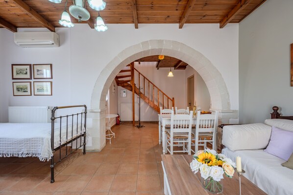 The vibrant village of Vamos is just 2 km away, while Douliana itself offers a cozy square with a local café, a mini-market, and a charming taverna — all within a village of only 40 houses. Within a 10 km radius, you can explore some of the area’s most beautiful beaches, including Almirida, Kalives, Kiani Akti, and Ombrogialos.