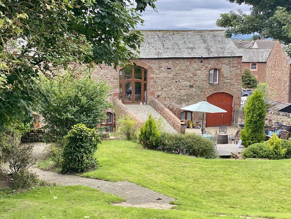 Converted barn in quiet Cumbrian rural village near the foothills of the Pennines. Three roomy boutique style bedrooms all with en-suite. Vaulted and beamed open plan Lounge/Diner/Kitchen with views to the large garden and pond. Lounge area boasts a cozy corner wood burning stove and 75” Smart TV for watching films or your favorite sporting event.