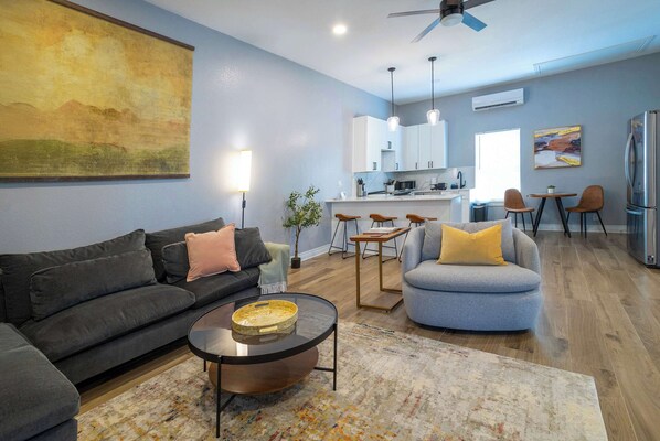 The bright entryway welcomes you into a beautifully designed space featuring high ceilings beside the open concept living area. A spacious, cozy sectional sofa and stylish chair provide the perfect spot to unwind with a book or enjoy a movie on the smart TV. Debating on preparing a home-cooked meal or grabbing takeout from one of the many nearby restaurants? Either way, you won’t be disappointed with the full-size kitchen, equipped with modern stainless steel appliances, crisp white cabinets stocked with essentials, and ample stone countertops with plenty of space to meet your needs.