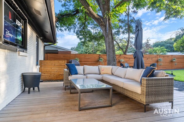 The fully fenced yard offers lush grass, a large tree with a swing, and space to enjoy cornhole and spikeball - all provided and ready to enjoy! A drink cooler (ice required) keeps refreshments chilled, and string lights overhead add warmth and charm. Up to two small dogs are welcome.