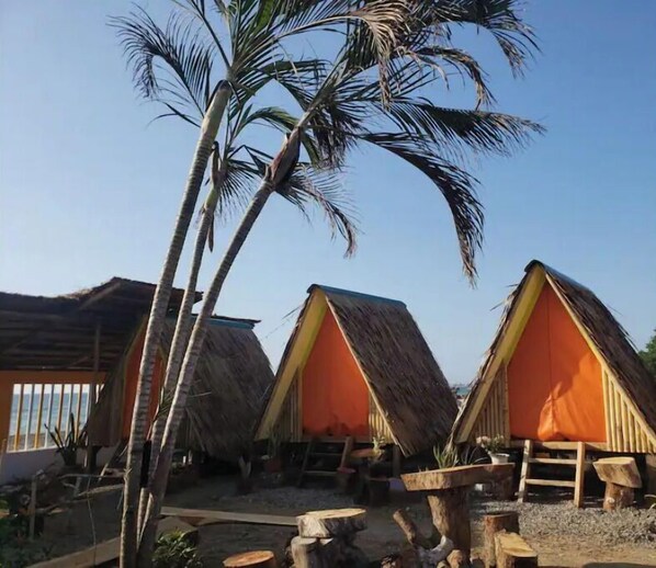 Right on the beach, this Swedish designed A Frame Kubo offers a serene escape. Awaken to bird song and the soothing sound of surf with an electric fan, light, and power outlet for comfort.