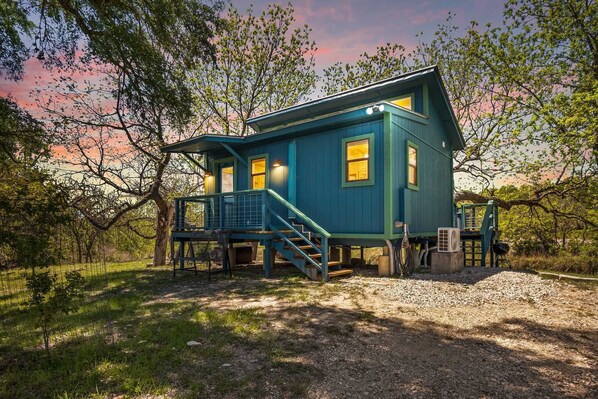 Escape to the Crazy Horse Cabin - a cozy, creek-side retreat with a private hot tub, queen bed, and wraparound deck overlooking the water. With direct creek access, 500 feet of waterfront, and a peaceful wooded setting, this cabin is ideal for a relaxing Hill Country getaway for up to 3 guests.