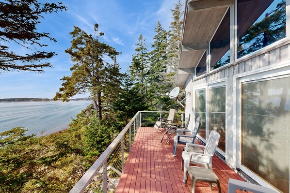 Boasting breathtaking views of Bass Harbor, this oceanfront home is a place of dreams and unforgettable memories. When you aren't gazing out at the vast blue depths of the ocean from the balcony, head down to the beach, steps away from the home's backdoor.