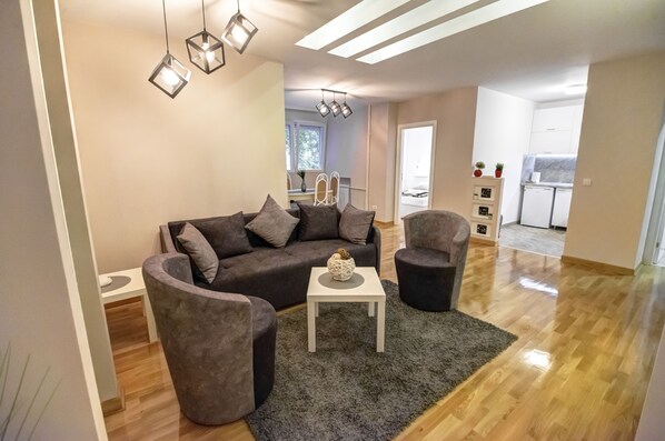 In the heart of Belgrade's city center, Skadarlija Apartment offers a tranquil retreat with a yard view. Perfect for families of up to 5, this fully-equipped apartment features two bedrooms, an elegant bathroom and kitchen, and a spacious living room with stylish finishes.
