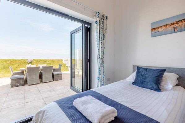 A reverse-level design means that all three bedrooms are on the ground floor of this stylish property. The light-filled, king-size bedroom has a door straight out to the garden; it also benefits from an en-suite shower room. The double bedroom features a vaulted ceiling and large window, plus its own en-suite shower room. And the spacious twin room, which has glazed doors to the patio, has use of a lovely family bathroom. On this floor is also a cosy snug with a TV, DVD and sofa. The wonderful open-plan living space is on the first floor - a vaulted room that includes a superb kitchen, a dining table for six and plenty of comfortable seating. You’ll be drawn straight to the views through the bi-fold doors that open to the balcony, but at night you may wish to draw the curtains and snuggle up with a movie on the Smart TV. In the summer, electric ceiling fans will keep you cool but, if you prefer to dine al fresco, the patio area has a dining set and a BBQ.