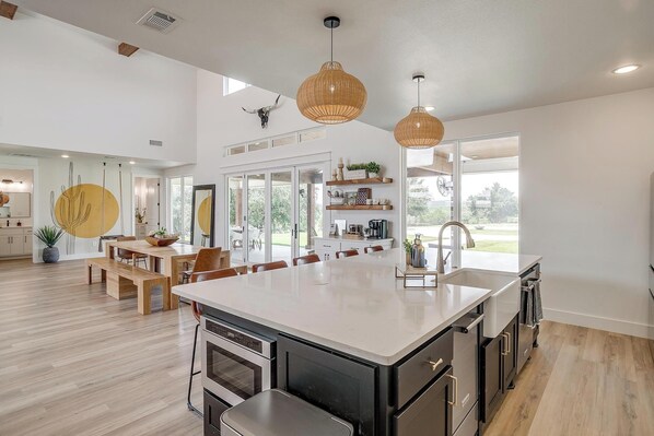 This newly built casa Blanca home boasts 5 King Suites and a Grand Hall. Each Villa features a kitchenette with fridge, mini freezer, full en-suite bathroom with shower, couch and eating area. The Grand Hall, which we've dubbed "The Gathering Room" boasts a large open space for your party to come together to cook meals in our brand new kitchen, fuel at our coffee bar, and eat at our large 10- seat dining table. The 32’ pool can be found just out the backyard.