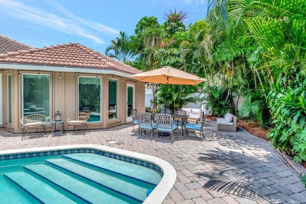 Outdoor dining - Idyllic Boca Pool Home: 4/2.5 + Study-FAU & Mizner (Boca Raton)