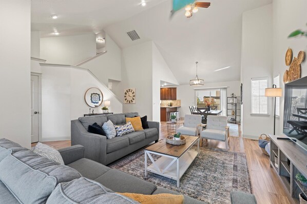 Spacious Getaway, Perfect for Groups, Fire pit, BBQ, 70" TV, near The Village, TopGolf, Parks