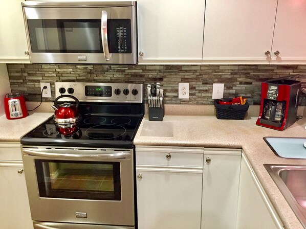 The kitchen is fully stocked with everything you need to cook and eat there. We have a beautiful 8 seat dining table plus 3 nearby bar stools at the counter. The kitchen has stainless steel appliances: fridge with ice maker, range / oven, dishwasher, and microwave. Dishwasher detergent is provided. There is a drip coffee maker with individual packets of coffee, sugar, and creamer.