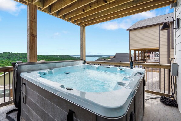 Escape to Modern Lake, a luxurious retreat within Crowne View Resort in Branson. Enjoy magnificent views of Lake Table Rock from the deck with its own fireplace and outdoor TV. Relax by the private hot tub or challenge family and friends to games like air hockey and foosball on the lower level.