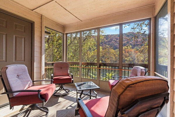The condo’s interior is the perfect home base between adventures, where soaring ceilings sit atop bright, open spaces expertly curated to maximize your rest and relaxation. Curl up on comfortable sofa and armchair seating in the living room while you stream all your favorite shows on the smart TV. In the cooler months, switch on the fireplace to create a cozy ambiance for a family night in featuring your favorite movie. Step through the sliding door onto the screened-in balcony, where panoramic views of the river and rolling countryside provide a stunning backdrop for your morning coffee or an evening cocktail. Back indoors, the fully equipped kitchen will have you whipping up your go-to meals in no time, offering stainless steel appliances, stone countertops, and cabinetry stocked with cookware and dining ware.