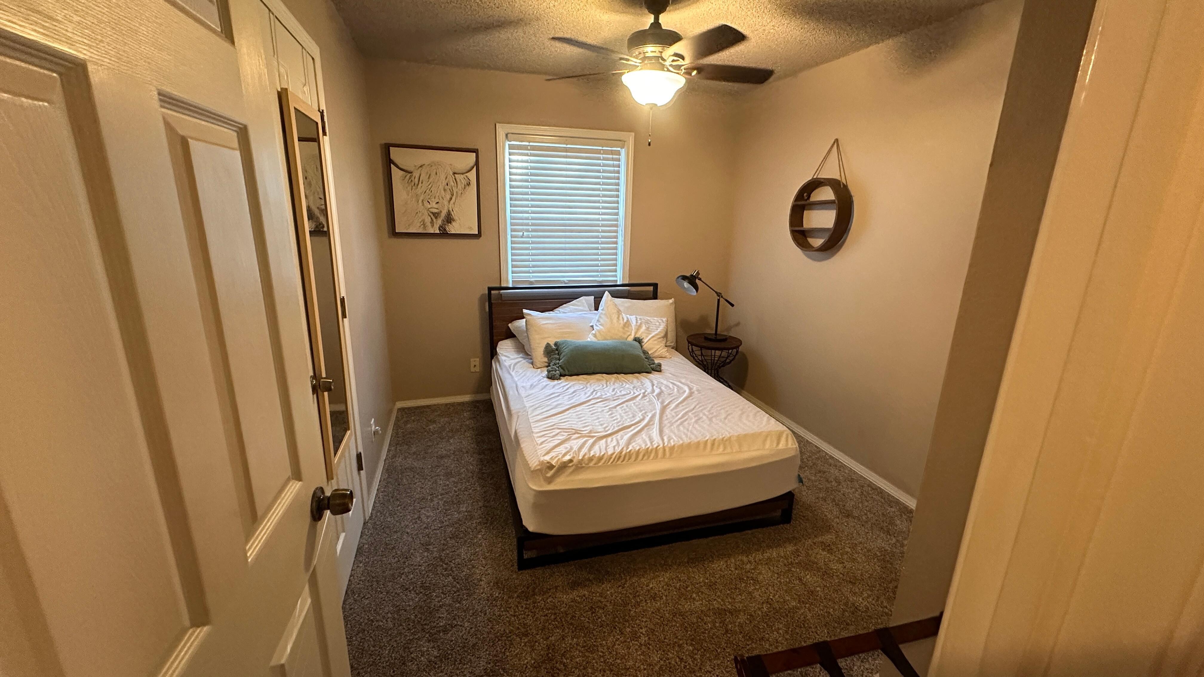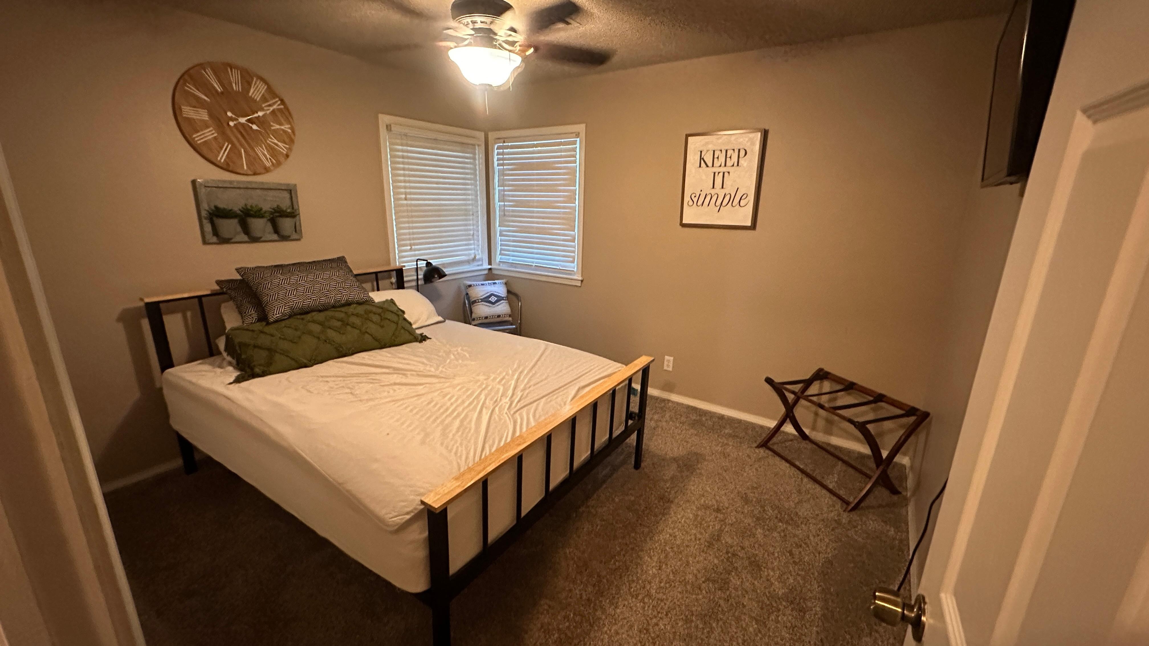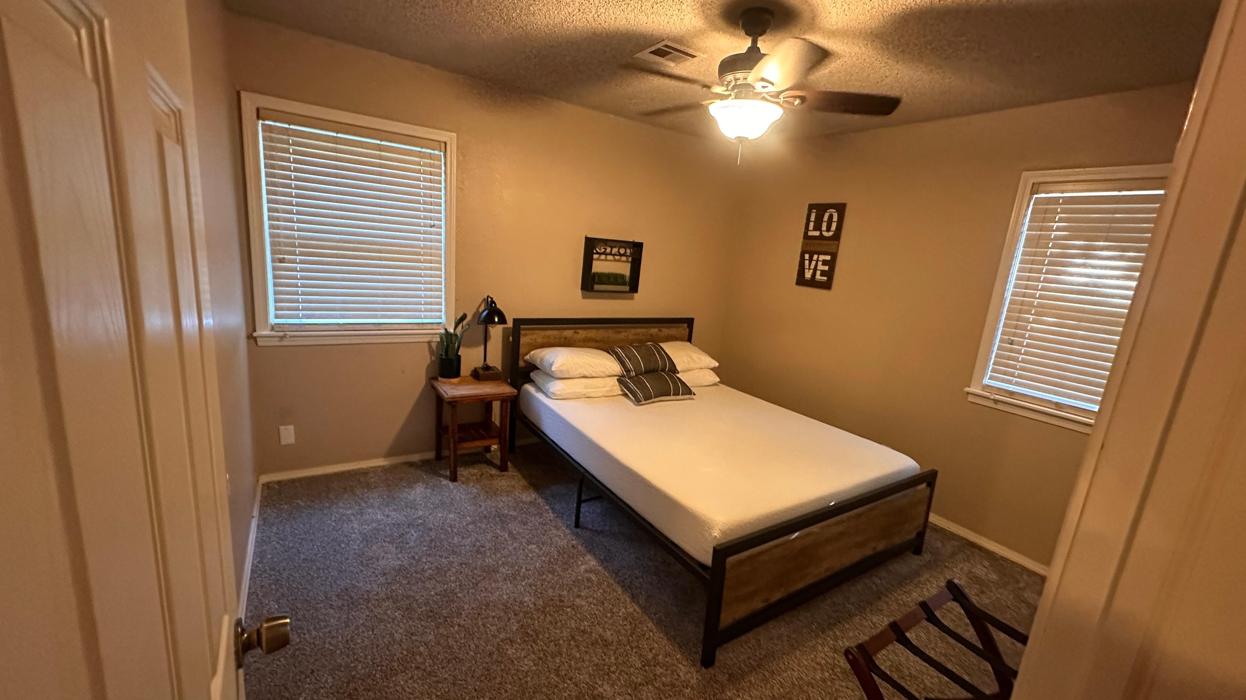 We want you and your family to have a comfortable stay and will provide coffee/tea, snacks and plenty of clean blankets to curl up under. The house is newly furnished throughout with one queen and two full beds on all new carpet and wood floors. Apple TV , Disney+, and Hulu provided on 55 inch 4K TV as well as high speed internet(200 mbps)! You will have so many options outside with 11 different chairs to relax in! Play bocce, corn hole, or disc golf in the backyard or sit on the patio at sunset. Nothing beats sitting around the fire with friends and family and enjoying refreshments!Walk to tennis and basketball courts or your little ones can step out the back gate and be on the playground in less than a minute. There is a Walmart Neighborhood Market a few blocks away if you need anything and Target just a few miles away. Enjoy a fully stocked kitchen and washer and dryer on site. Plenty of parking available. Minutes away from pizza, barbecue, gelato, steakhouse,coffee shops, a brewery, sushi, mexican and more! Check out downtown shopping or go to the spa. Great for families and business travelers alike. Close to Bass Pro, Performing Arts Center, Rhema, and The Warren Theatre!