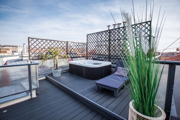 Beautifully situated in the heart of the city, this charming triplex offers a haven for relaxation and entertainment. Unwind on its unique 35 sqm terrace with Jacuzzi, soak up city views or indulge in some quiet time by your own TV in one of its two bedrooms.
