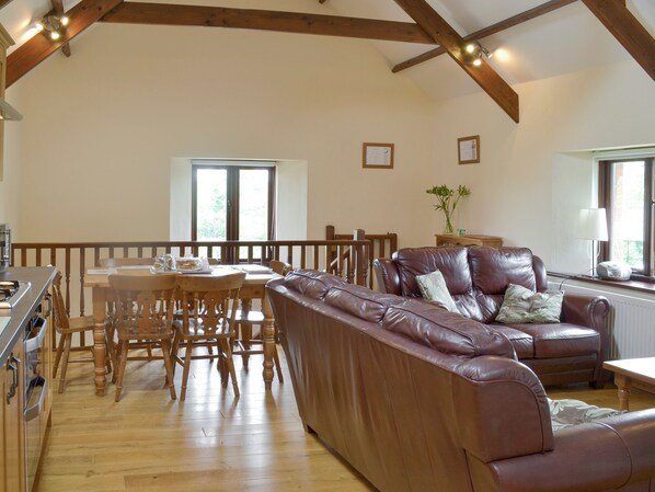 A semi-detached barn conversion set in a sheltered valley with sheep and cows in the nearby fields. Can be booked with the neighbouring property to sleep 12.. Ground Floor: