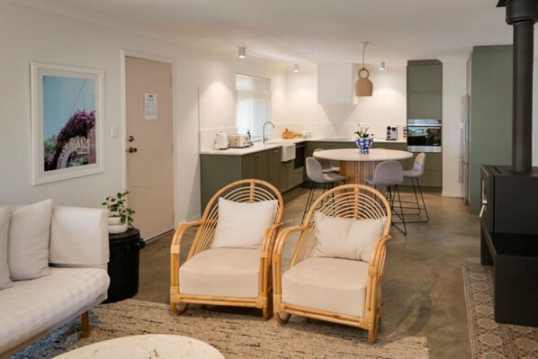 The living area offers reverse cycle air conditioning for your comfort. Also enjoy the lovely wood fire to warm the house on those cool winter nights.