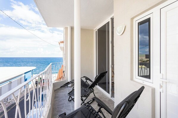Distributed over two floors, this property is ideal for families, couples and business trips, as it has Wifi internet connection and capacity for 5 people. On the ground floor from where you enter the property, there is a fully equipped kitchen with all appliances, a nice living room with Smart TV, a bathroom with shower and a large bedroom with two single beds that can be joined or separated as needed. On the upper floor of the flat there are two spacious bedrooms and direct access to a cosy outdoor terrace with sea views, where you can relax or have lunch. The master bedroom has a comfortable double bed and built-in wardrobe and the second bedroom has a single bed. On the same floor there is also a complete bathroom and an office with a desk, ideal for teleworking and access to a charming balcony with sea views and an outdoor table.