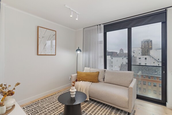 This modern studio apartment has been thoughtfully designed to combine style and functionality. The open-plan layout features a plush queen-sized bed, a Smart TV with Netflix for relaxed evenings, and a fully equipped kitchenette with all the essentials to prepare light meals or a quick coffee before heading out to explore the city. The sleek bathroom includes a walk-in shower, offering a fresh start to your day. Large windows fill the apartment with natural light and showcase views of Cape Town’s vibrant cityscape. Whether you’re here for work or play, the space is crafted for comfort and convenience. The Building & Amenities