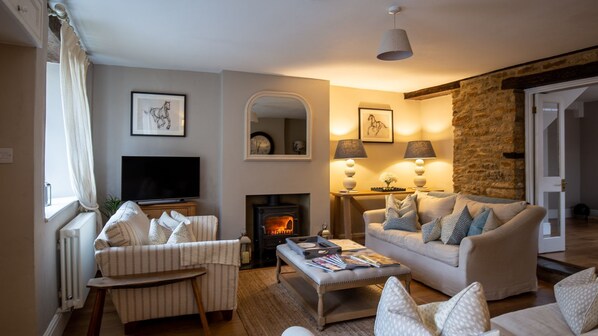 This elegant room has two windows looking out over Park Street and across the road to a row of honey-coloured cottages. There is a beautiful oak floor and a wood burning stove set into a contemporary inglenook, with a feature stone wall that's home to shelves holding books and decorative items. The room is furnished with two large and comfy sofas, a vintage snuggle chair, and an antique sideboard with reading lamps, which bathe the room is a soft cosy glow.
