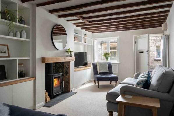 The open plan lounge is perfect for a relaxing night in after a day exploring, with sofas, smart TV, DVD player, Sonos speaker, books and games, exposed beams, and the original stone fireplace with log burner. The lounge opens directly onto the quiet street, and you can sit and watch the world go through the little window.