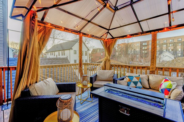 ⋗ Our balcony/terrace includes a projector, outdoor furniture, and a cozy fire pit.