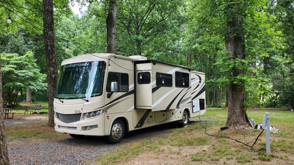 Class A RV on a private 5 Acre Property with RV campsite and trail.