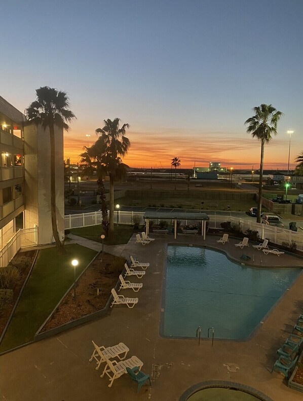This is a 1 bedroom fully furnished condo with an amazing view of the beach and the USS Lexington. The condo is setup with 1 queen bed in the bedroom, bunk beds in the hallway and a queen size sofa bed in the living room.