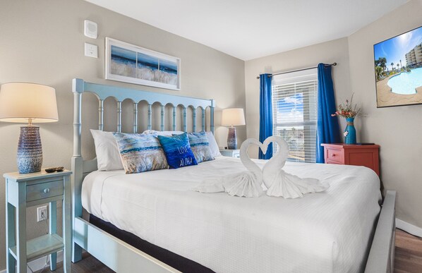 From the very moment guests walk in to #418, they will be instantly enveloped in the calming blue and teal tones perfectly scattered throughout this condo. This fourth floor unit has the perfect vantage point of both the pool and the beautiful, Port Aransas Beach! The living room seating is well thought out and includes 2 swiveling, rocking chairs in adorable coastal themes and a queen sofa sleeper for an additional 2 guests to either spend the night on or enjoy an evening in while catching a movie on the 55", flat screen, SmartTV.
