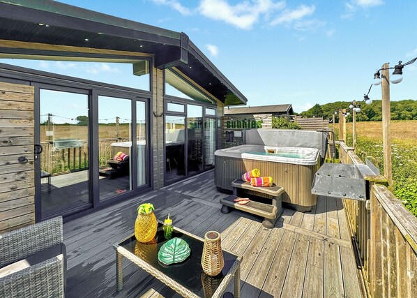This modern and contemporary one bedroom lodge has unrivalled views over open countryside making it the perfect romantic getaway. The large master bedroom has a king-size bed, Smart TV, walk-in wardrobe/dressing area and an en suite shower room. The open-plan living/kitchen area has a Smart TV and generous seating perfect for movie nights. Alternatively strike up a game of pool on the combined pool/table tennis/diner. The modern kitchen has all mod cons including a microwave, coffee machine and dishwasher. Island seating gives a choice of where to enjoy your meals. Patio doors lead to a private decked area perfect for relaxing and unwinding on comfy rattan furniture. The Hot Tub has now been weatherproofed by the addition of a Tilt and Turn gazebo over allowing you to enjoy it year round whilst taking in the field views beyond. Parking directly outside the lodge. No pets.. Hoseasons’ Best In Britain Award 2024 Winner – Large Park