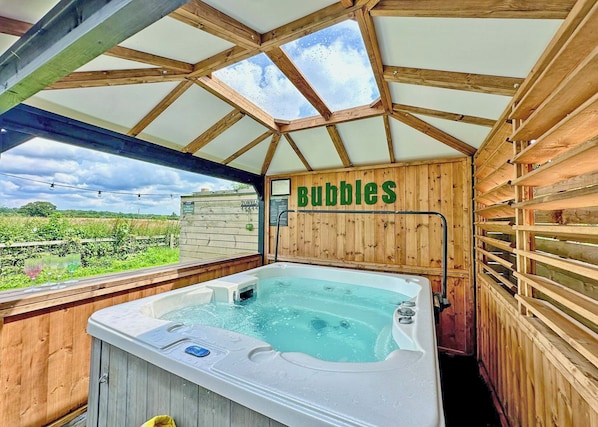 Doors lead to the fabulous outside area with steps down to a large new patio where a tilt and turn gazebo covers the comfy rattan seating. Here you can take in the impressive countryside views and relax in the privacy of your outdoor hot tub which is weather proofed with a modern timber gazebo and side bar with stools. Dine al fresco using our BBQ stand and picnic bench. Festoon lighting and our signature Raywell Cabana Bed complete this amazing outdoor space.. Hoseasons’ Best In Britain Award 2024 Winner – Large Park