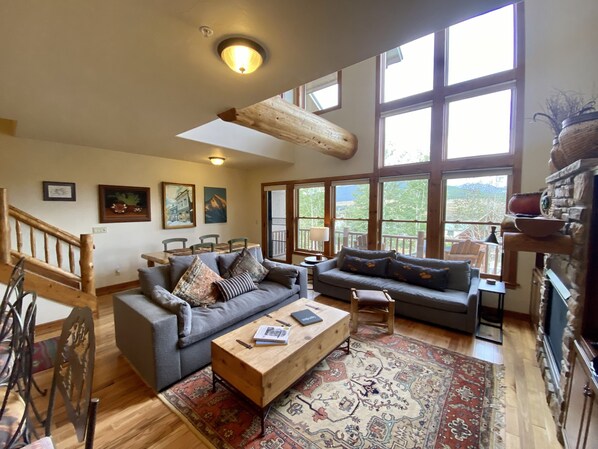 This huge 2000 square foot, 3 bedroom plus den town-home is a newer property in Crested Butte AND is 1/2 block from the slopes. Fabulous kitchen, amazing master bedroom - big king. King in the second bedroom, 2 singles in the third bedroom and queen pullout in the living room. Heated garage. Dining table feeds 8. Beautifully appointed in Colorado style, with beamed ceiling- the town-home has full bus access to all of Crested Butte right in front. Balconies with incredible valley views from the 2-story windows. Enjoy breathtaking Colorado sunsets from the comfort of this living room! It is one of the most beautiful rentals in Crested Butte of this size. The garage is heated, for two vehicles parked in tandem, a third vehicle can park outside in front of the garage. *Please note garage is not suitable for large oversized trucks/vans. In winter, it's walk to lifts - you don't have to cross a street to get to the West Wall and Peachtree lifts. In Summer, you have incredible views down the green valley of Crested Butte, and it's an easy walk to the lifts, which you can take in the summer and mountain bike or walk down. There is a common hot tub that has a gorgeous view - it's outside and is beautiful.