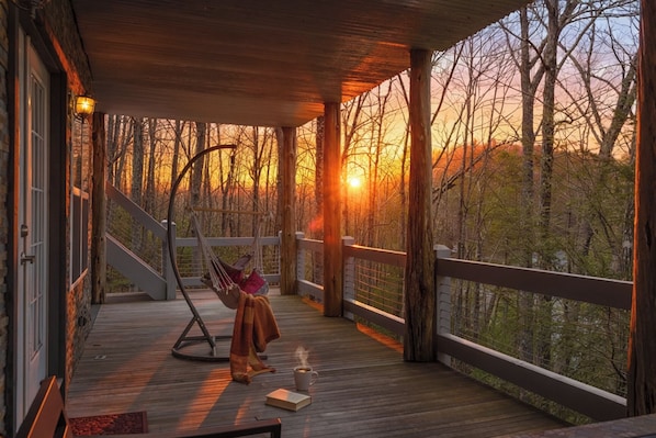 Welcome to LAKIN’ IT EASY ! This log cabin is one of the very few waterfront vacation rentals in the high country. Main level has 1 bedroom with QUEEN bed/Flat Screen TV, and Full pull out couch, shared full bath, fully stocked kitchen including all full size appliances and an abundance of kitchen gadgets and small appliances including Cuisinart Mixer, Keurig coffee maker and regular drip, toaster and more. Luxury dining room area that overlooks the lake and a living room area with two separate niches one for TV watching and one for enjoying the fire. Main level also includes access to walkout full deck overlooking pond and plenty of seating for you and your guests. Upper level master with KING and private full bath, shower only, shower has multiple shower heads, 2 wands, and rain shower heads from above. There is also a small loft with extra seating and a desk with screen and printer on upper level. Basement has full bath with walk-in shower tub combo also doubles as steam shower, tub. 2 sets of bunk beds in lower bedroom one is full over full one is twin over full. (See pictures) Laundry is on the lower level in a mud room off the back deck as well as the game room with air hockey,fooseball,pacman machine and various games for your friends and family to enjoy. Lower level also has the movie area complete with massive flat screen TV and surround sound to really amp up the experience! Flat screen TV's on main floor family room, master suite, main floor bedroom and lower game room/movie room. House has a Skybest high-speed internet. PacNPlay available, please bring your own sheets.