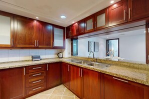 This spacious and modern Two bedroom apartment is perfect for two couples or a family of four, it also has a maid`s room, please note that this room only has a child size bed. Featuring elegant furnishings and state of the art building facilities, Vacationer guests have all the amenities needed for a comfortable stay including high-speed Wi-Fi throughout with average speeds of 250mbps.