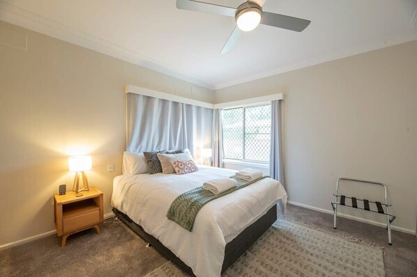 • Bedroom 2: Queen, AC + Ceiling Fan