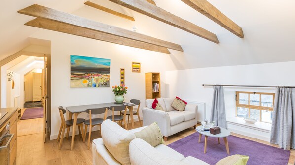 Light streams into the principle living space, which accommodates the Lounge, Kitchen and Dining area. The high ceiling and exposed original timber beams create an impressive and airy space to relax and enjoy views of the Pentland Hills to the South. There is a wood burning stove, which heats the room well in the colder months.