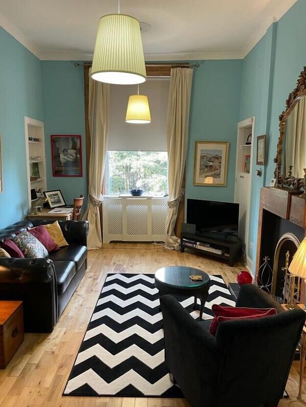 This lovely, bright and clean two bedroom and one a half bath flat was situated on a beautiful and quiet crescent in the heart of the very trendy Broughton area of Edinburgh. It is only a 10 minute walk from Waverley Rail Station and Princes Street. There are literally LOADS of shops, markets, cafes, pubs, and British and ethnic restaurants within a few minutes walk in any direction. A large Tesco supermarket is only a 5 minute walk down the hill. The flat is gorgeous! Beautiful wooden floors and creative area rugs, full of art show posters and beautiful artwork in every room (even the bathrooms!), two gorgeous fireplaces, beautiful comfortable beds with thick down duvets, fashionable and comfy furniture, a fully stocked kitchen with every appliance you could imagine. The kitchen also was stocked with the basics - tea, coffee, condiments, and even fresh milk for our arrival. When we had occasion to ask the owner for something, Tom responded immediately and delivered the requested items within the hour. You can tell Tom loves literature and the arts as the ethos of the flat is resplendent with the love of beauty and hundreds of books to get lost in. It was like being a guest in someone's home, but with the privacy to do whatever you wanted in one of the most beautiful cities on the planet. Tom is also a bit of a Scottish celebrity in the true crime field, and you should definitely ask him about it! I loved every minute of our 7 night stay in this absolute gem of a flat.