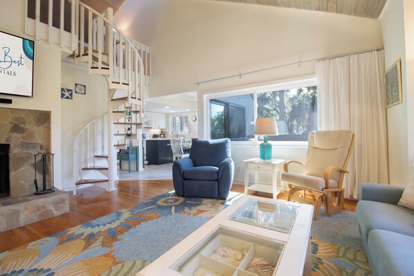 This unique villa sits overlooking the golf course. This coastal home is warm and inviting. The living room has floor to ceiling windows for 180 degrees of nature views. The fully equipped kitchen is an open layout with the dining room for plenty of room to cook up your favorite meals. Enjoy your morning coffee from the porch while watching coastal birds and golf balls fly by! The main floor has two bedrooms with a spiral staircase that leads to the loft. Enjoy the king bedroom that has a full ensuite bathroom. The second guest bedroom features a queen bed and access to the second bathroom. Both bedrooms have attached sunrooms with twin trundle beds. The loft has a queen, single bed, and trundle twin bed. The loft is perfect for the younger generation to have their own space to hang out. Extended stays are made possible with amenities like WIFI, SmartTVs with Sling TV, washer/dryer, dishwasher, and outdoor shower.