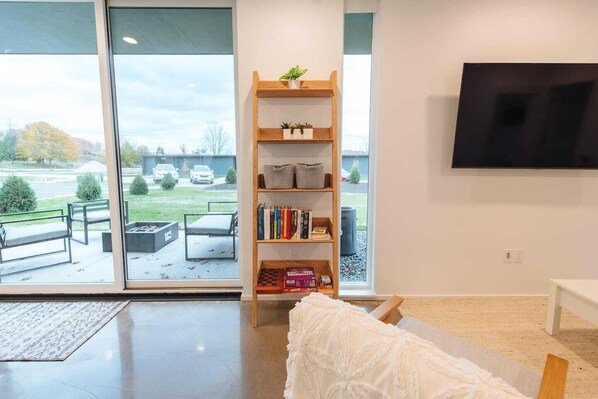 Measuring 1500 sq ft, the Flat features a kitchen with quartz countertops, stainless steel appliances, and all the amenities needed to prepare meals. The open concept living area includes table seating for 8, and large sliding glass doors that open to a private patio. The patio has comfortable seating around a gas firepit and a gas grill.