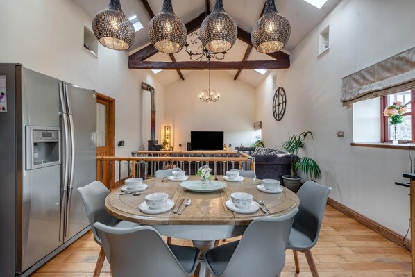 Outside, the fully enclosed garden offers a fantastic space for relaxing and socialising. Your canine companions can roam safely while you unwind in the garden bar or enjoy al fresco dining under the pergola beside the gas fire table. There’s room to park up to five cars, and the outdoor setup ensures the whole group can make the most of summer evenings together.
