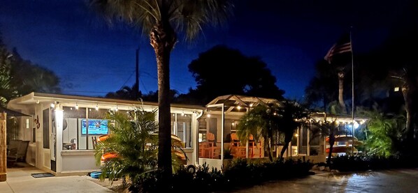 When quality and cleanliness are important, The Pool House delivers on both and more! Lush tropical landscaping welcomes you to your suite. Enter into the open floor plan, living room, dining area and fully stocked kitchen. Cook, dine, or relax by the pool or your own back yard patio. This area is truly a tropical paradise complete with a Tiki bar with outdoor TV, Weber grill, commercial grade outdoor table, chairs, chaise lounges, lush landscaping and soft night lighting. Don't forget to experience showering in our custom made fully enclosed outdoor showers with hot water. There's just nothing like showering outside under they blue sky and tropical palm trees.