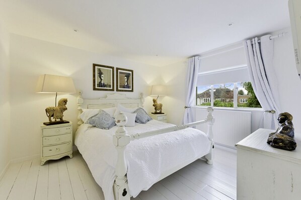 Tucked away behind a wall, our charming cottage offers a peaceful retreat with a spacious, private garden featuring plenty of seating and outdoor dining space. Inside, the calm white walls, stunning art, and tasteful décor create a relaxing ambiance while preserving the cottage's unique charm.