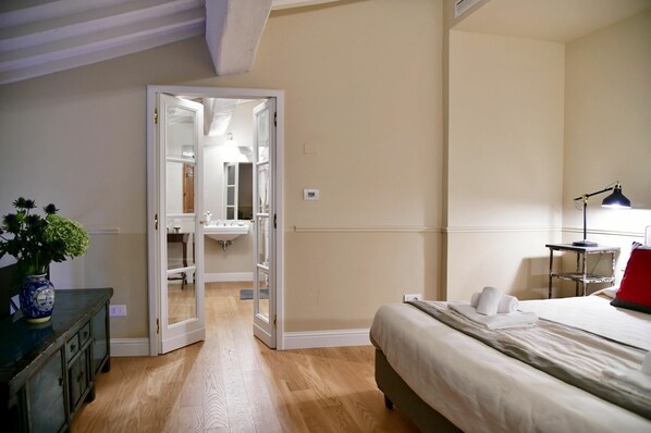 Bedroom + Ensuite Bathroom: double bed (length: 200m, width: 160m), WIFI internet, internet, air conditioning, safe, basin, toilet, bidet, shower, hairdryer.