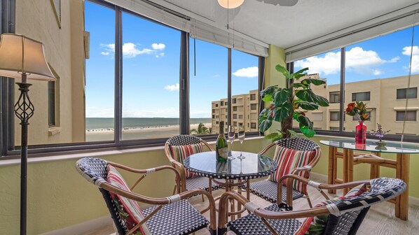 Endless Summer offers spectacular views of the beach and the Gulf of Mexico. This condo has 2 bedrooms and 2 bathrooms. The living room is spacious enough for everyone to sit around watching their favorite movie or catching up about your day while sipping on your favorite cocktail. The living room offers a plush couch and loveseat as well as an ottoman, and a big screen TV for your enjoyment. Just off the living room is the Florida room where you will find yourself taking in the amazing views, while enjoying your morning coffee, your after dinner drink, or the breathtaking sunsets, if you are lucky, you may even see a dolphin or 2 swimming in the Gulf.