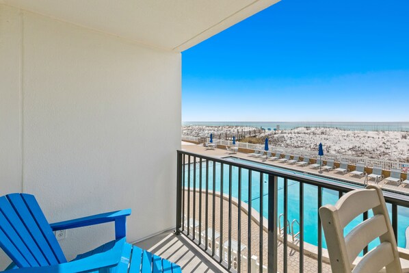 Set right on the white sands of Okaloosa Island, this bright and summery condo is spacious enough for the whole family. Here you can prepare meals in the well-equipped kitchen, dine together at the breakfast bar and the adjacent table, and then kick back and relax in the sunlit living area with a huge 70” Samsung LED UHD Smart TV. For more privacy, stream a favorite show in the main bedroom on the 58' smart TV. Or step out onto the balcony where you can enjoy the view while you sip morning coffee or close out the day with an evening cocktail. Enjoy access to a shared outdoor pool and a fitness room.
