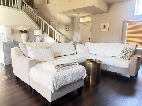 Unwind in a beautifully furnished, family-friendly home featuring warm décor, cozy living spaces, and plenty of room to relax. The open-concept living area includes a fully equipped kitchen, dining area, and a welcoming lounge perfect for gatherings after a day of adventure.